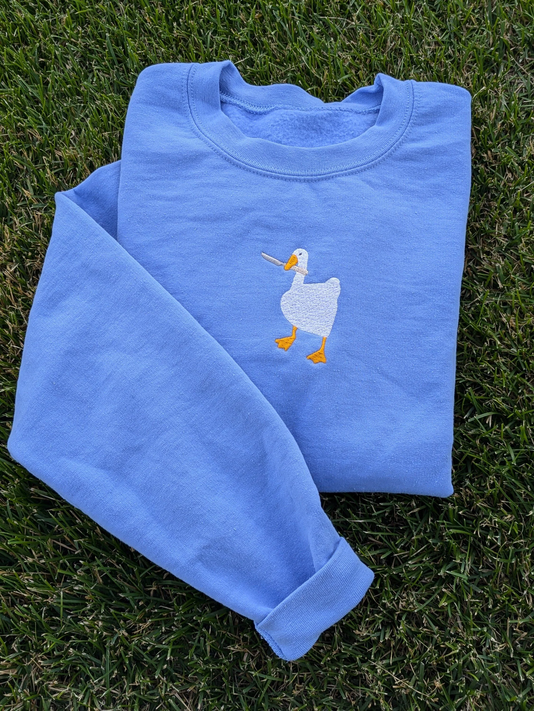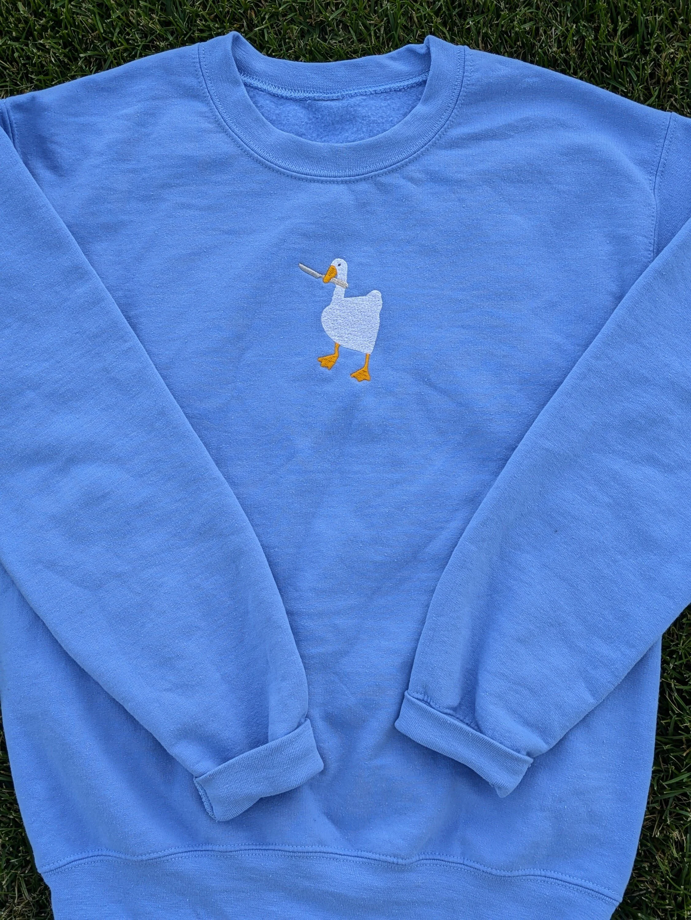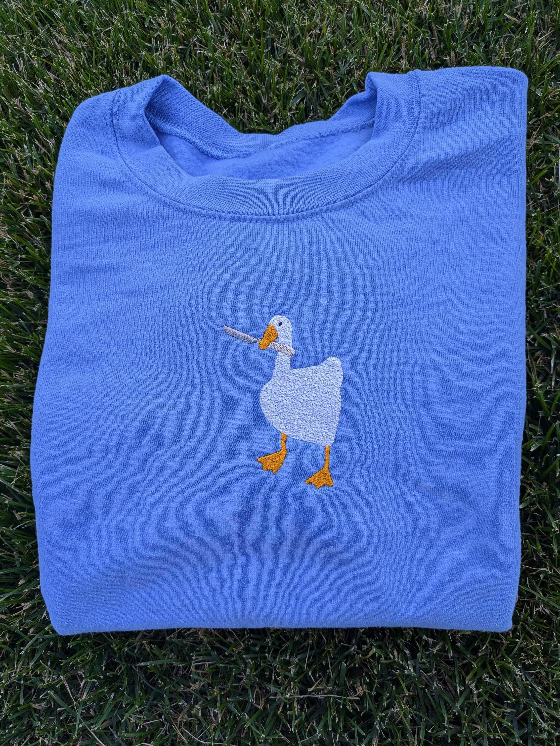 Peace Was Never an Option! 🔪 Get your hands on this inspired, unofficial Untitled Goose Embroidered Fan art Sweatshirt. Featuring the iconic honking goose wielding a knife, this cozy crewneck is the ultimate gamer pullover and a hilarious gift for fans of the game and meme culture.