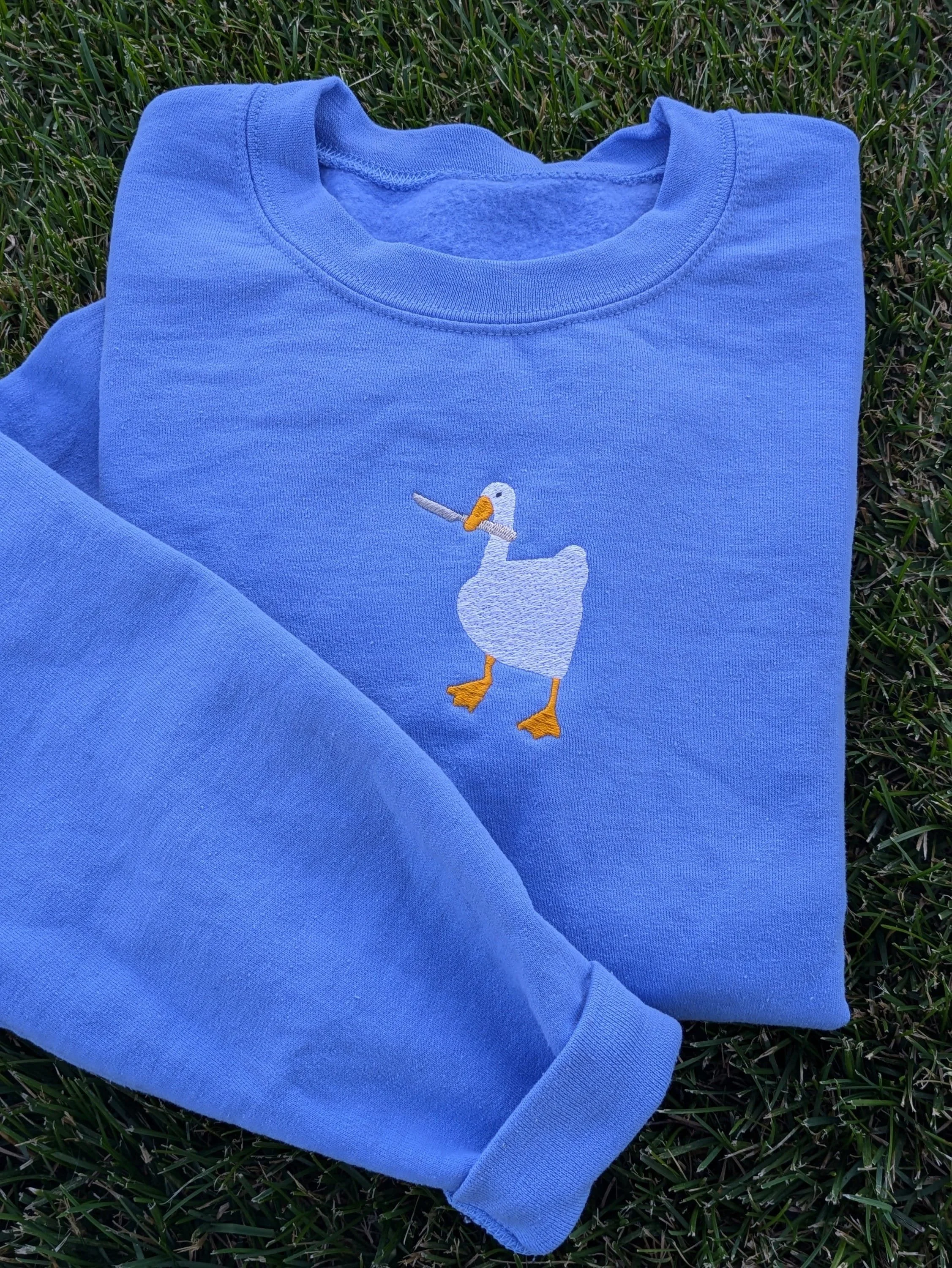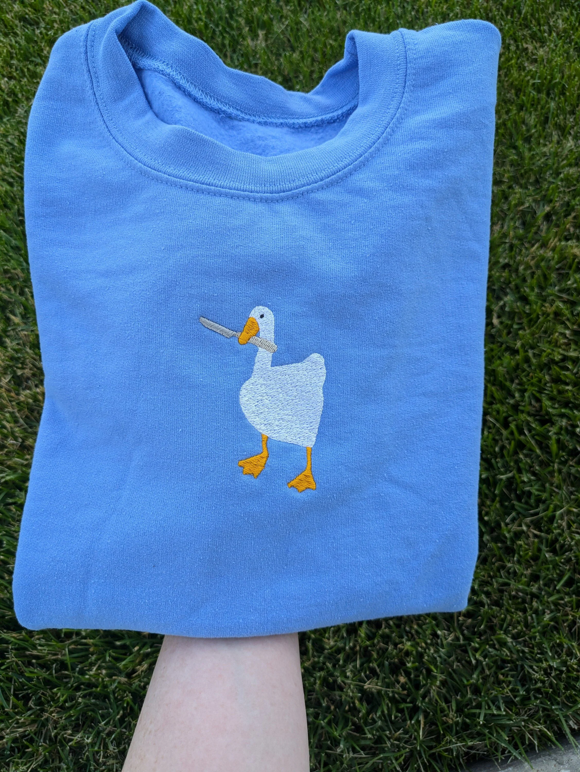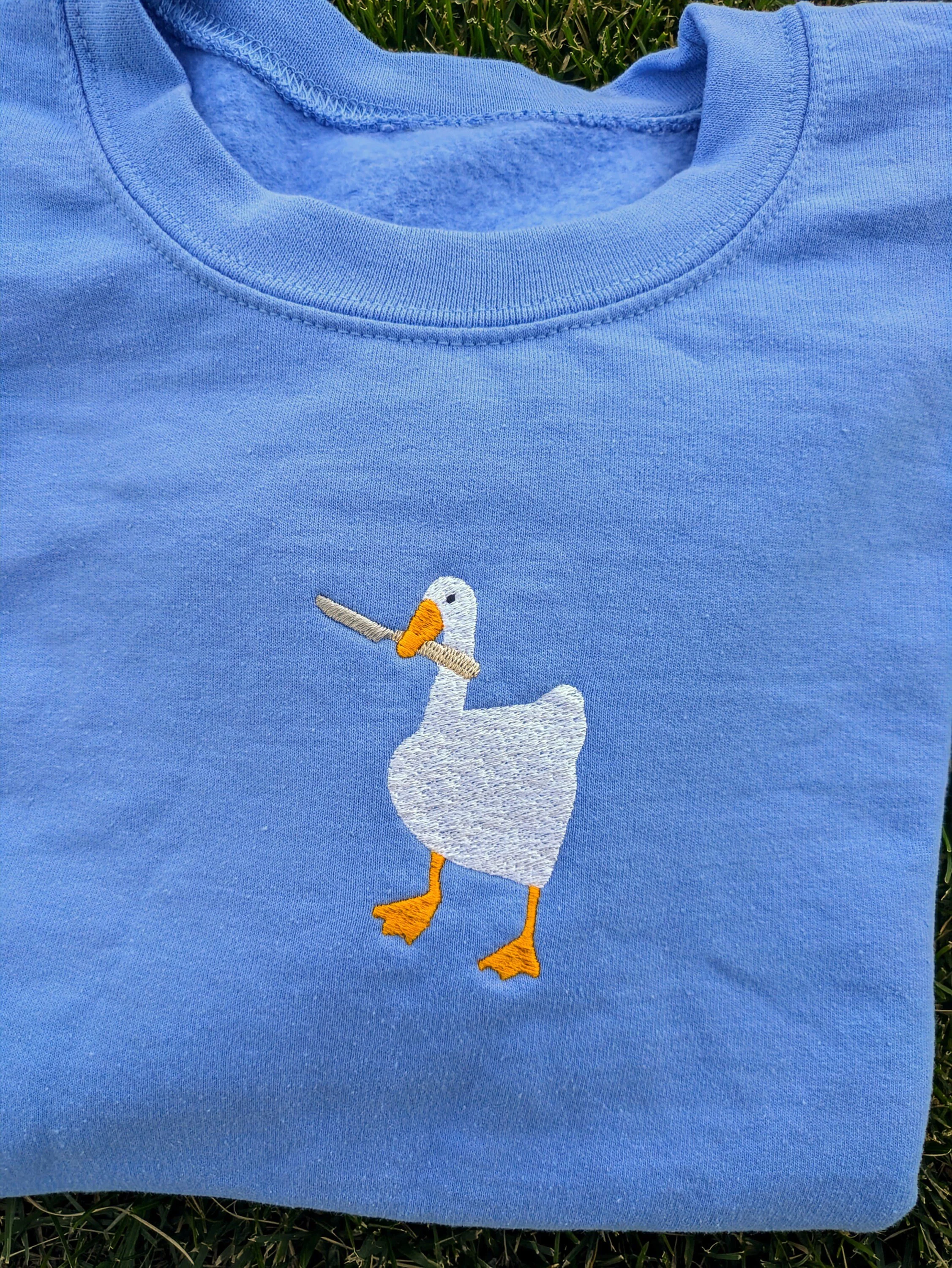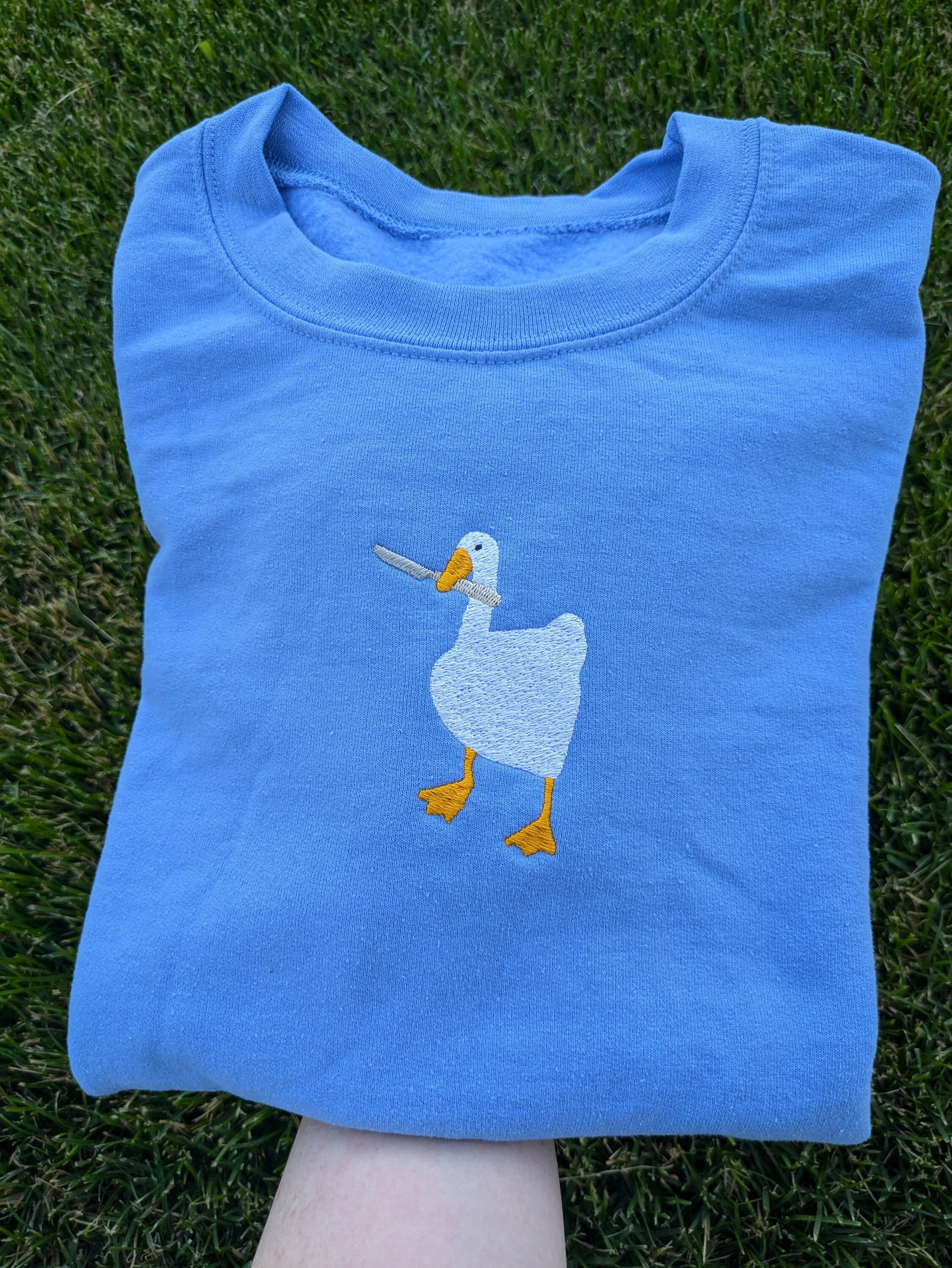 Peace Was Never an Option! 🔪 Get your hands on this inspired, unofficial Untitled Goose Embroidered Fan art Sweatshirt. Featuring the iconic honking goose wielding a knife, this cozy crewneck is the ultimate gamer pullover and a hilarious gift for fans of the game and meme culture.